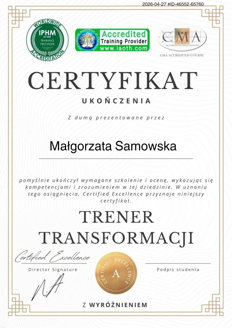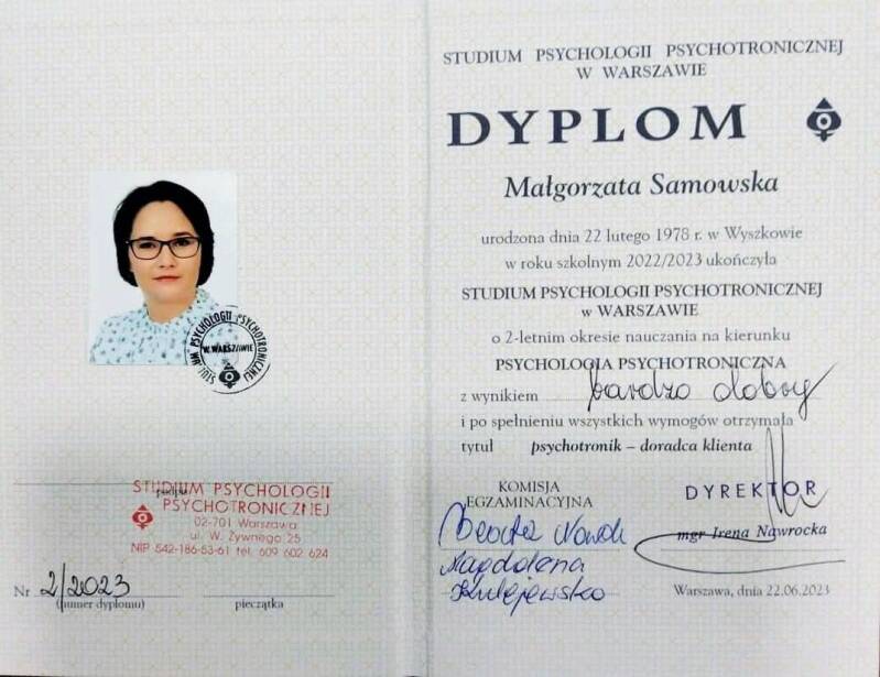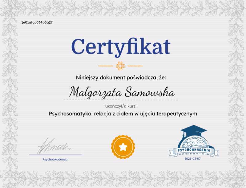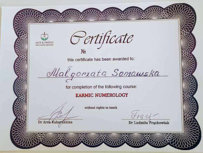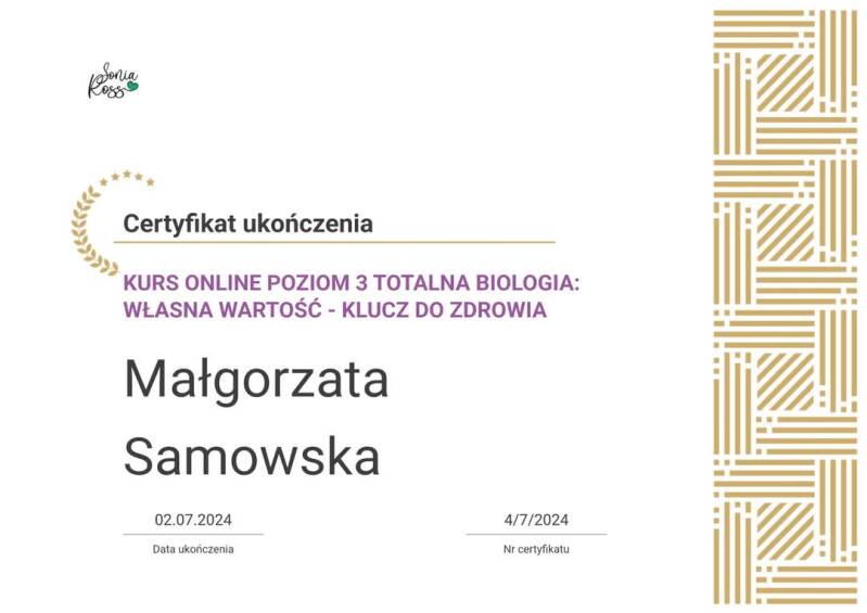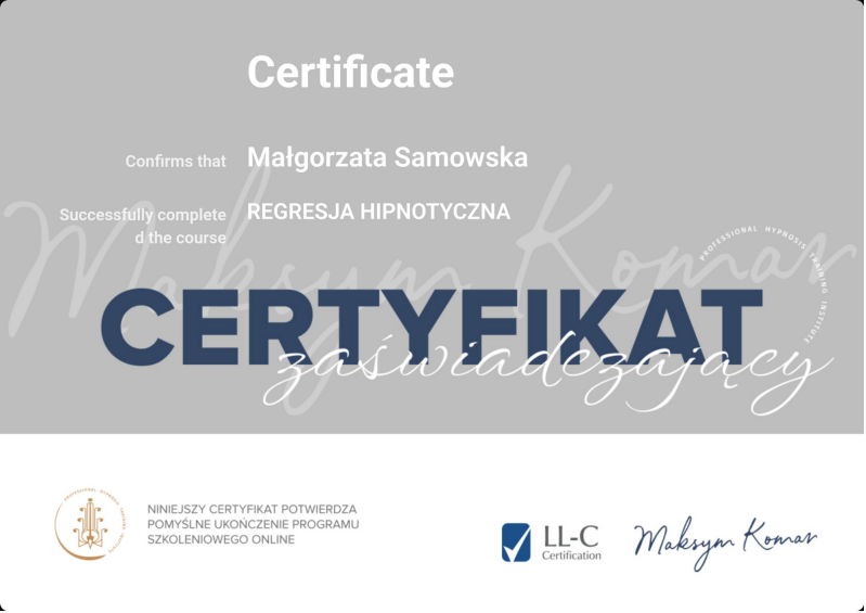 Każdy z tych dokumentów odzwierciedla moje zaangażowanie w rozwój osobisty oraz zawodowy. Wśród nich znajdują się certyfikaty ukończenia różnych kursów, warsztatów, dyplomy ze Studium Psychologii Psychotronicznej, oraz inne potwierdzenia moich umiejętności. Każdy etap mojej edukacji przyczynił się do mojego obecnego profilu zawodowego, który z dumą prezentuję. Zachęcam Cię do zapoznania się z tymi ważnymi dokumentami, które pokazują moje kompetencje i pasję do nieustannego rozwoju.