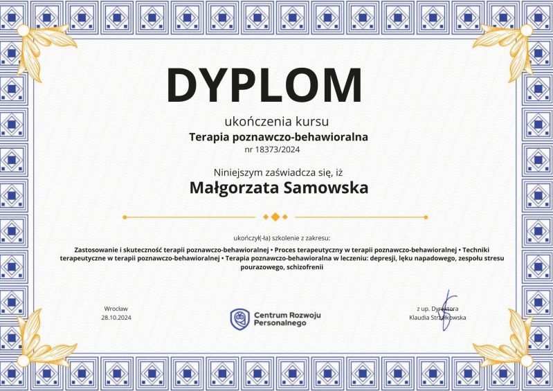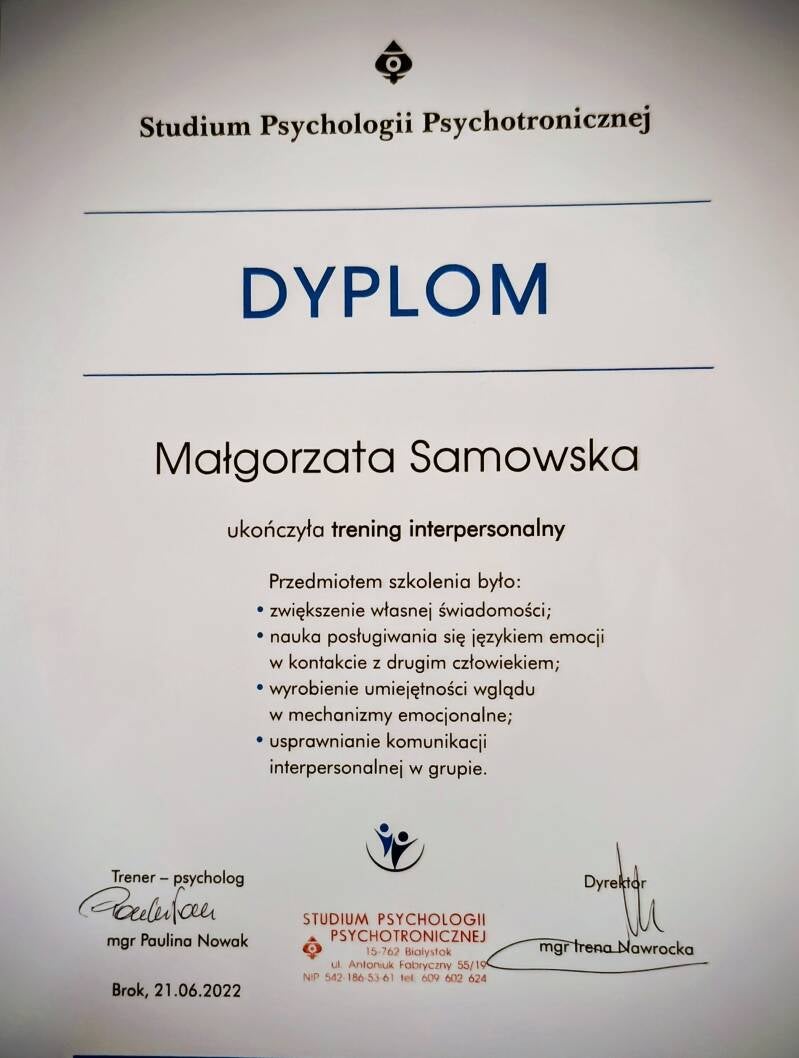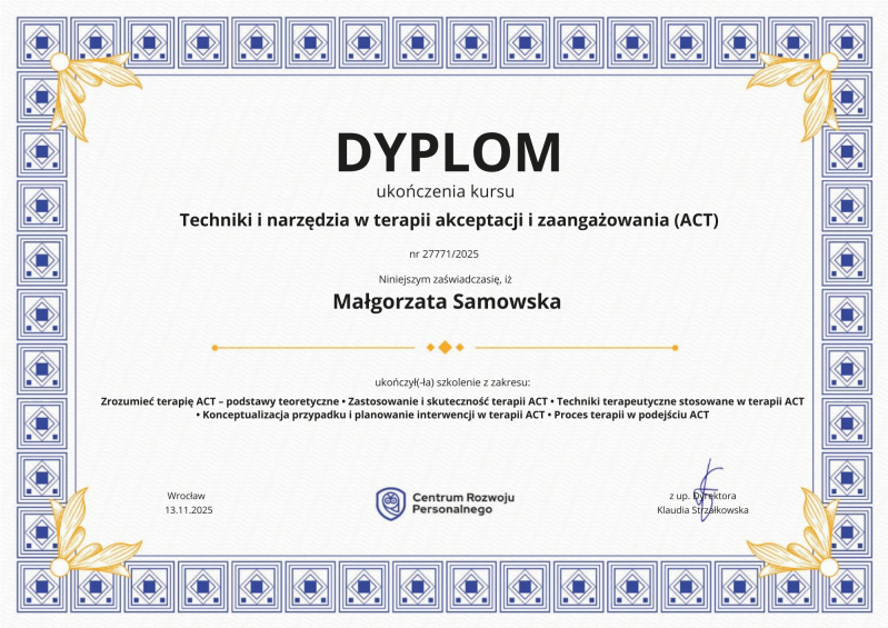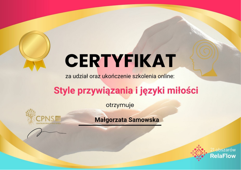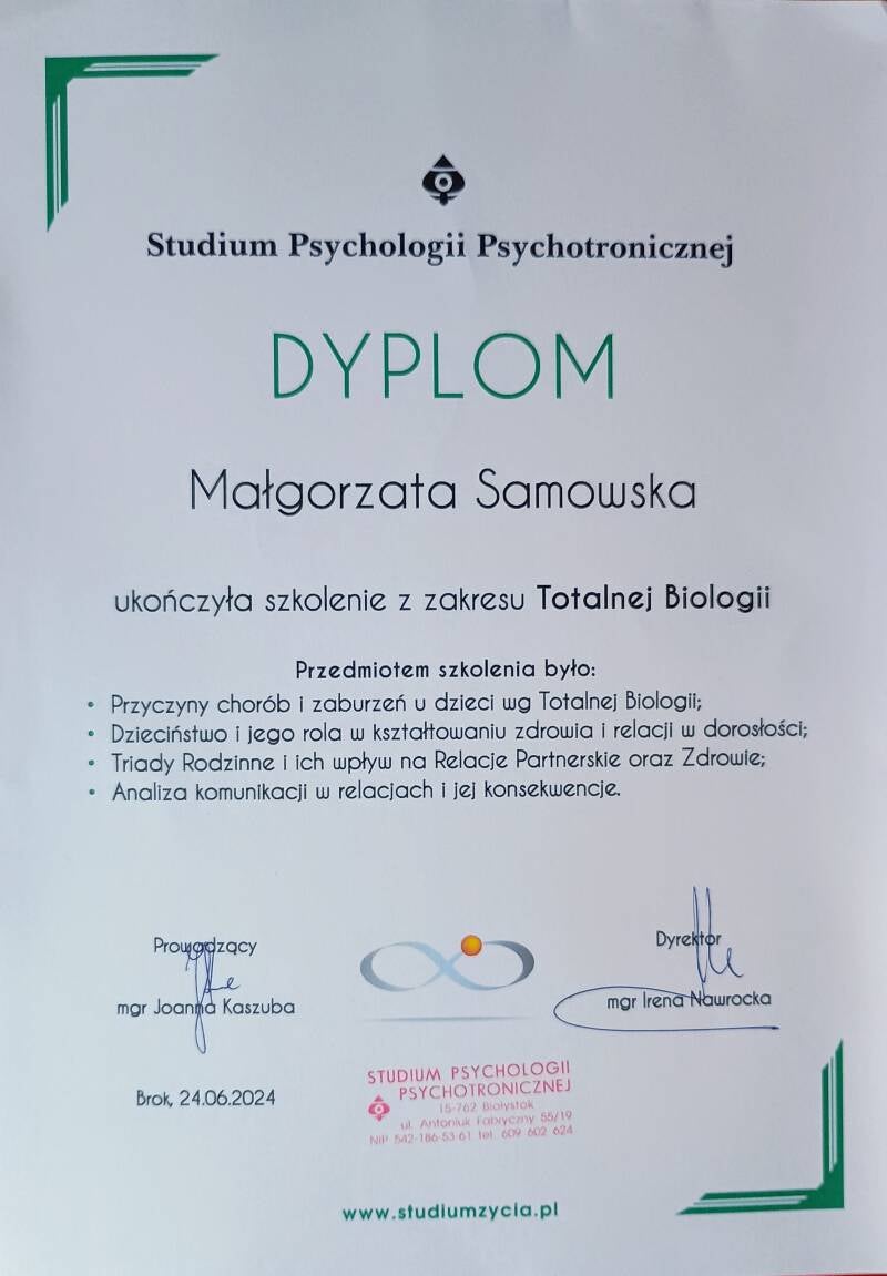 Każdy z tych dokumentów odzwierciedla moje zaangażowanie w rozwój osobisty oraz zawodowy. Wśród nich znajdują się certyfikaty ukończenia różnych kursów, warsztatów, dyplomy ze Studium Psychologii Psychotronicznej, oraz inne potwierdzenia moich umiejętności. Każdy etap mojej edukacji przyczynił się do mojego obecnego profilu zawodowego, który z dumą prezentuję. Zachęcam Cię do zapoznania się z tymi ważnymi dokumentami, które pokazują moje kompetencje i pasję do nieustannego rozwoju.